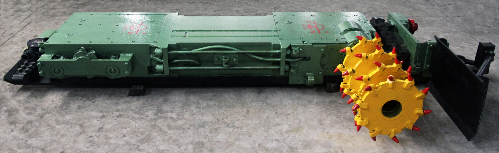 MG100—TP(YRG4型)型極薄煤層單滾筒爬底板采煤機(jī)。該采煤機(jī)適用于煤層厚度為0.5~0.95m,煤質(zhì)中硬(f≤3) 傾角<30°的煤層,當(dāng)傾角>15°時(shí),機(jī)器要增加防滑絞車。該機(jī)采用液壓傳動、錨鏈牽引、無極調(diào)速,操作簡單。該機(jī)與SGD420/22或SGB420/30型刮板輸送機(jī)、單體液壓支柱配套使用,具有功率大,整機(jī)強(qiáng)度高,可靠性高,安全有保障等特點(diǎn),可實(shí)現(xiàn)極薄煤層普采工作面機(jī)械化開采。